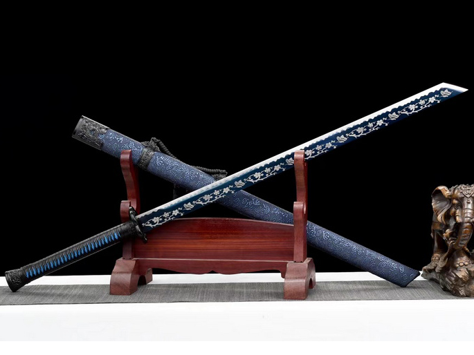 商品参数 总长:108cm 刃长:73cm 柄长:31cm 刃宽:3.6cm 刃厚:0.6cm 硬度:58HRC 刃材:锰钢 鞘材:皮革包实木 装具:合金 工艺:淬火(油)—回火 锻打程度:十二道纯手工研磨 赠品:锦盒-刀油-收藏证书-刀架