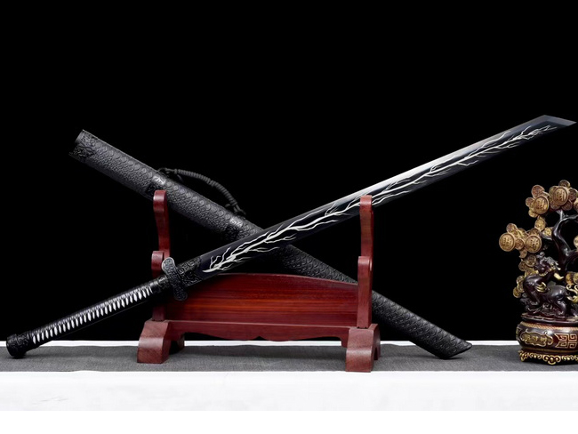 商品属性 [总长] 107cm [刃长] 71cm [柄长] 29cm [刃宽] 4.0cm [刃厚] 0.5cm [硬度] 58HRC [刃材] 锰钢 [鞘材] 实木包皮革 [装具] 合金 [赠品] 锦盒-刀油-收藏证书-刀架 [重量] 1.55kg